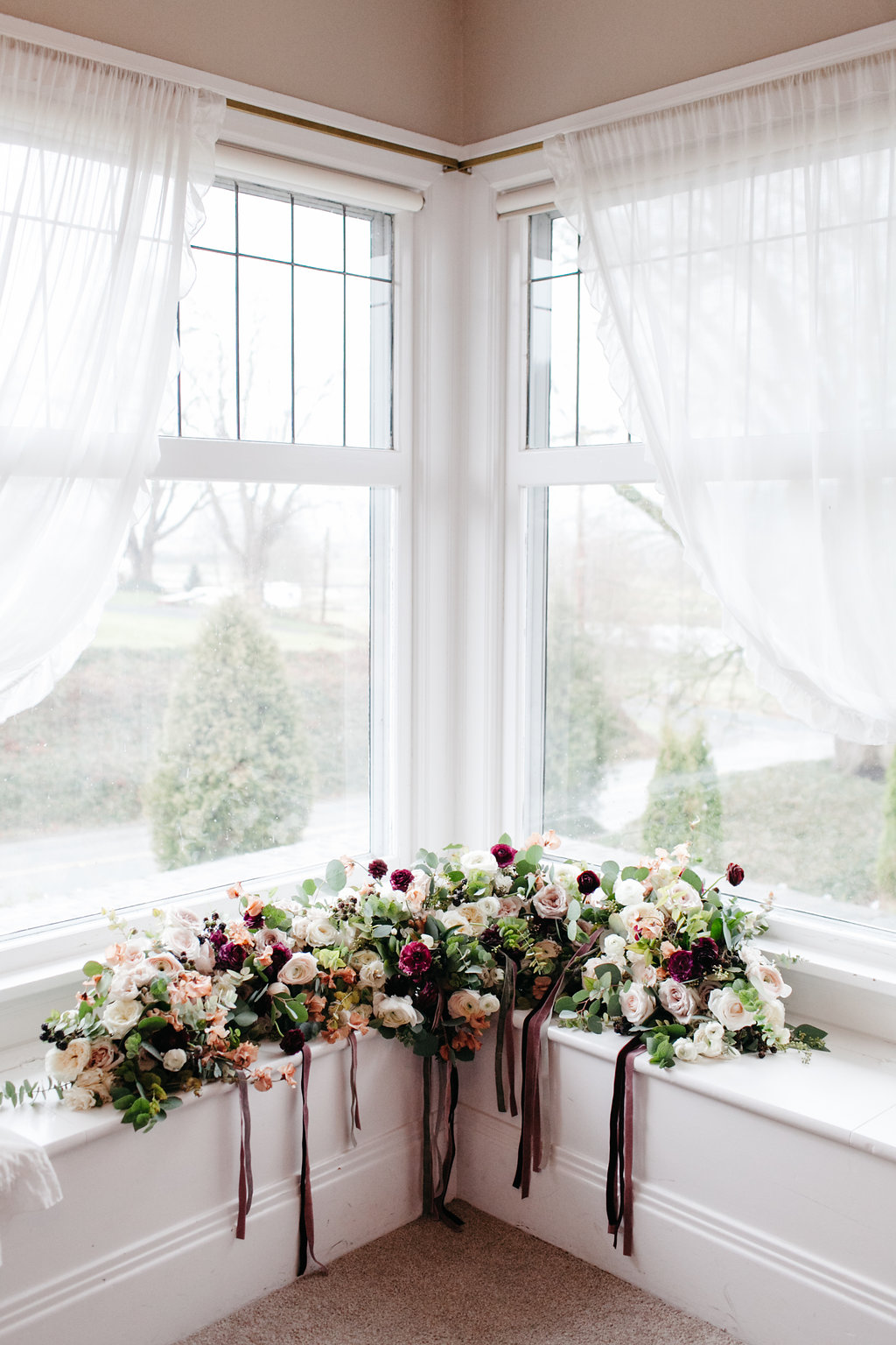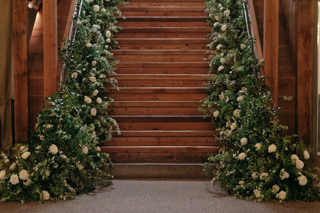 One of the spotlight pieces that our team worked on was this amazing floral staircase. The venue was quite unique, in that the ceremony was held upstairs and the reception on the main floor. The staircase in itself was a fairly lovely statement, all in wood and very broad - making it the perfect place to create a trailing, garden-inspired installation moving up and down the staircase. It was the perfect backdrop for newlywed photos!