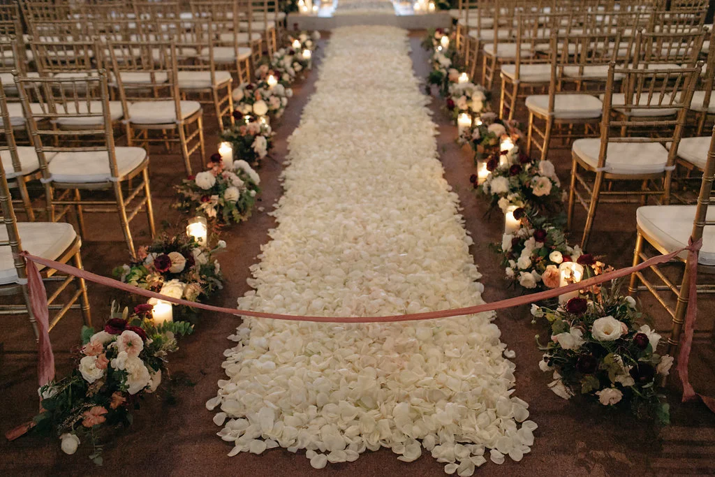 To see Hailey and Joe say their vows under this veritable garden was the perfect way to finish the day. The aisle was covered in thousands upon thousands of rose petals, along with lush centrepieces lining the walkway.