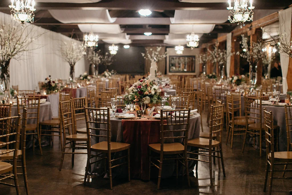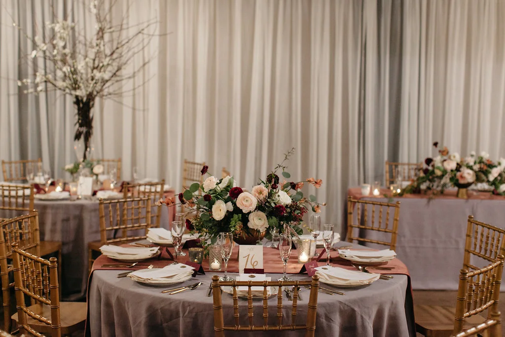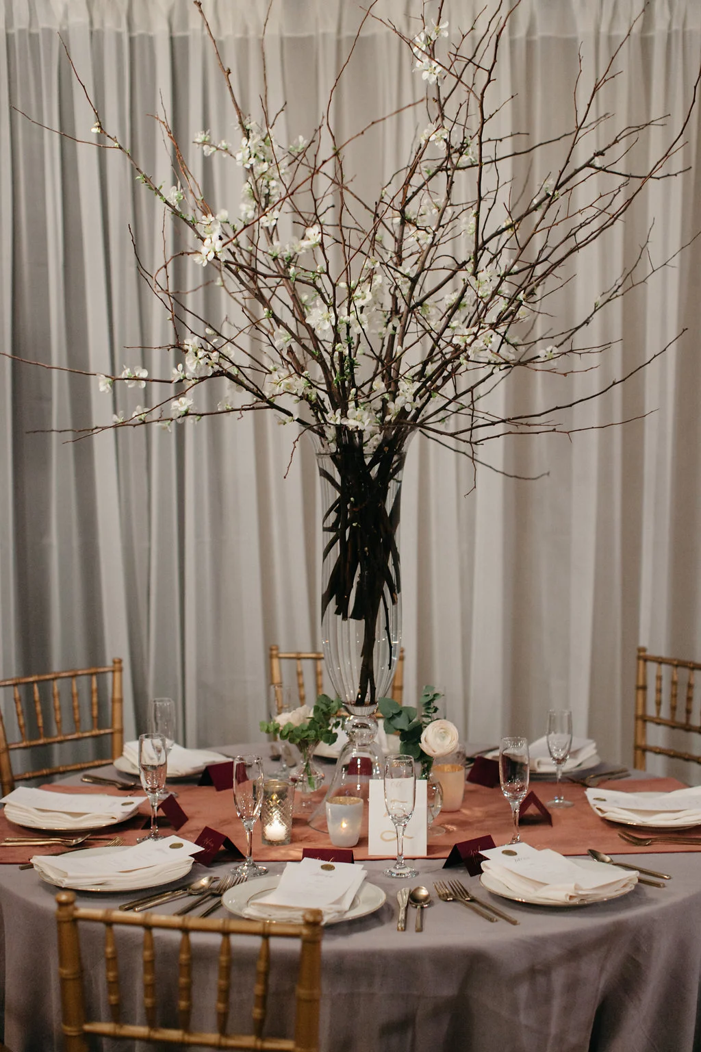 Steve from Sinclair & Moore designed the reception very carefully, highlighting the space's best features (like working with the long, narrow floor plan to its best advantage), while camouflaging the less than sightly sections, like panelled walls and a low ceiling. He chose two centrepiece styles: one, a tall arrangement of flowering branches with stem vases and coloured glass candleholders, and the other a low, lush floral arrangement filled with the most beautiful blooms.