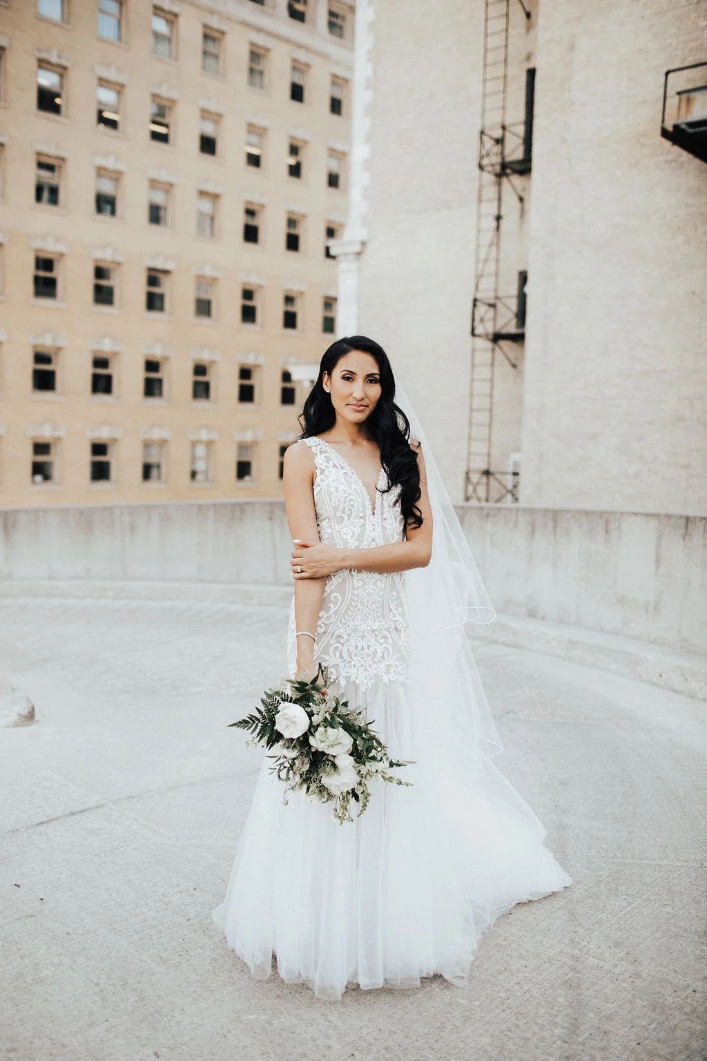 Chrystalle’s bouquet was actually the only piece I used actual flowers in! Her bouquet had an organic, freshly picked from the garden feel with all white blooms, including garden roses, snap dragons, lisianthus, and scabiosa mixed with ruscus, leather leaf fern, and seeded eucalyptus. The bridesmaids carried bouquets composed just of greenery.