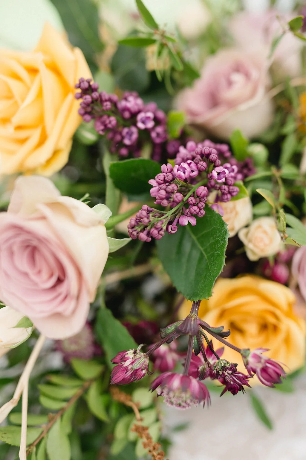 Bridal bouquet ingredients: roses, fritillaria, lilac, astrantia, spray roses, sunflowers (with their petals picked off - adding great texture!), and greenery.