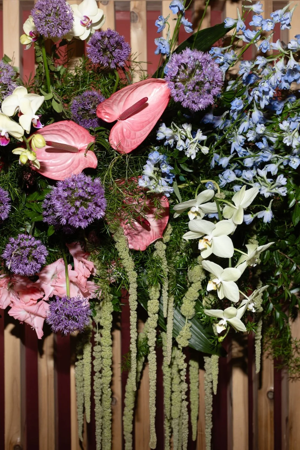 I wanted to design something sculptural, with strong lines, and a unique feel to it. I always love using allium in designs — those are the large purple “balls” that really command attention. I also decided to tuck in some strands of threaded gladiola, and we used stems of phalaenopsis orchids to get the right lime green (which is really hard to find in the flower world!).