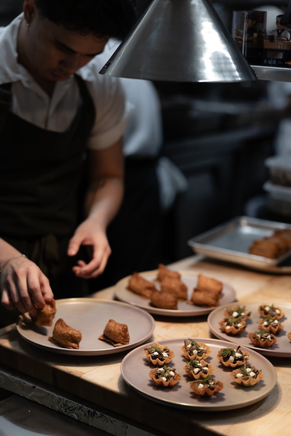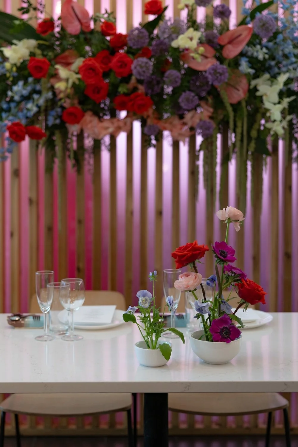 As with most restaurant weddings, we did not have a lot of tabletop space to work with. The focus is on the food and the drink, which is awesome! But Sharyne loved the idea of having some sort of focal feature in the space, and when we realized that we could use the slatted wall at the front entrance, the idea was set: a hanging floral feature moment, with their sweetheart table set in front of it.