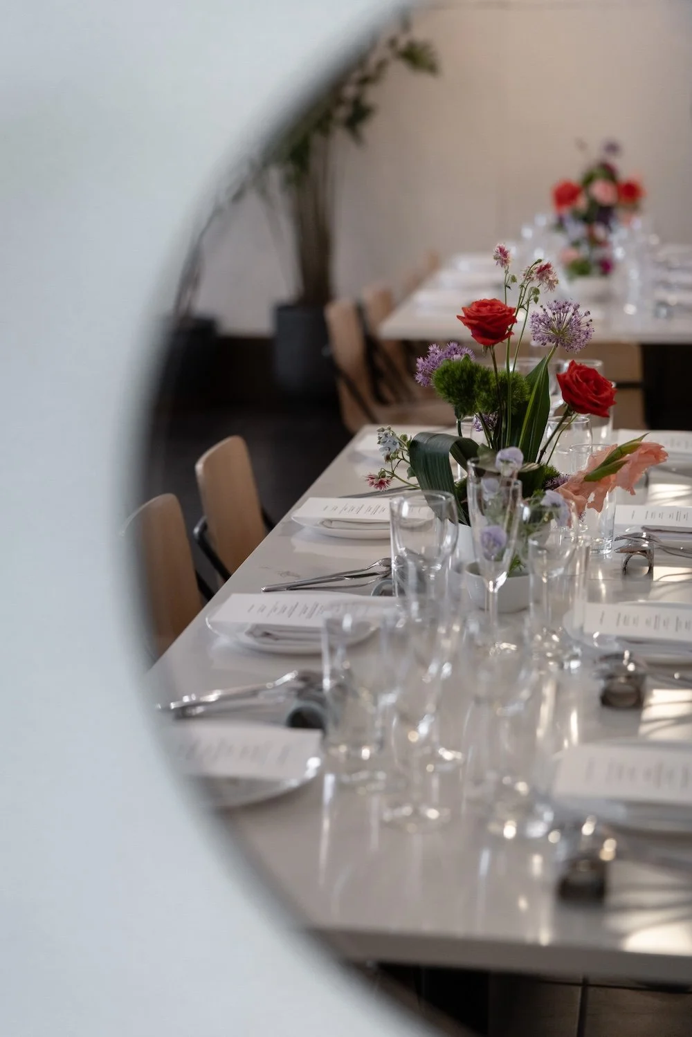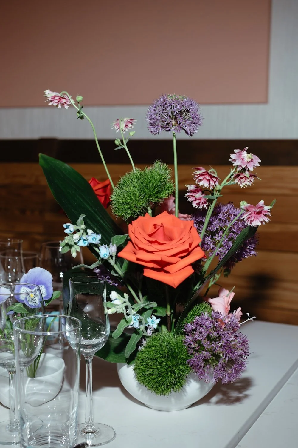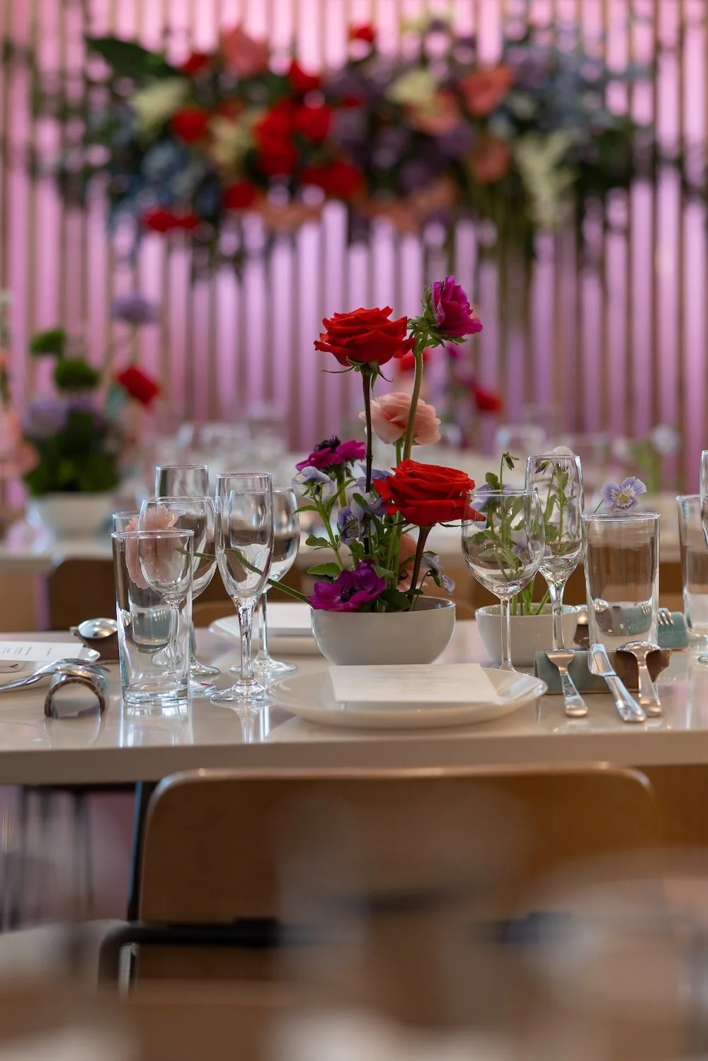 Of course I had to use my favourite red roses, nina. They’re just the most delicious, vibrant colour. I had ordered lavender anemone to pair with them, but they came in kind of fuschia. Would I have preferred the lavender? Yes. But sometimes, a problem becomes its own solution and the brightness of the fuschia worked really well with the space.