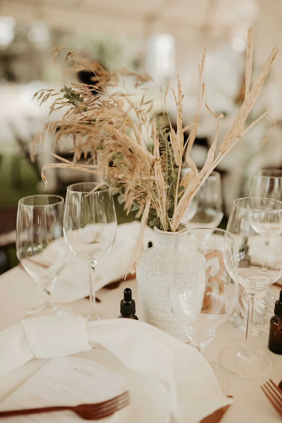 Margeaux came to me with just a couple of inspiration photos (along with a full design board created by her planner, Alli Mae Events) and she really loved the bleached foliage look and dried flowers. I knew that toffee roses would be the perfect bit of warm colour for her, and while she didn’t want a lot of greenery, I was excited when she liked my idea to incorporate some cool toned foliage.