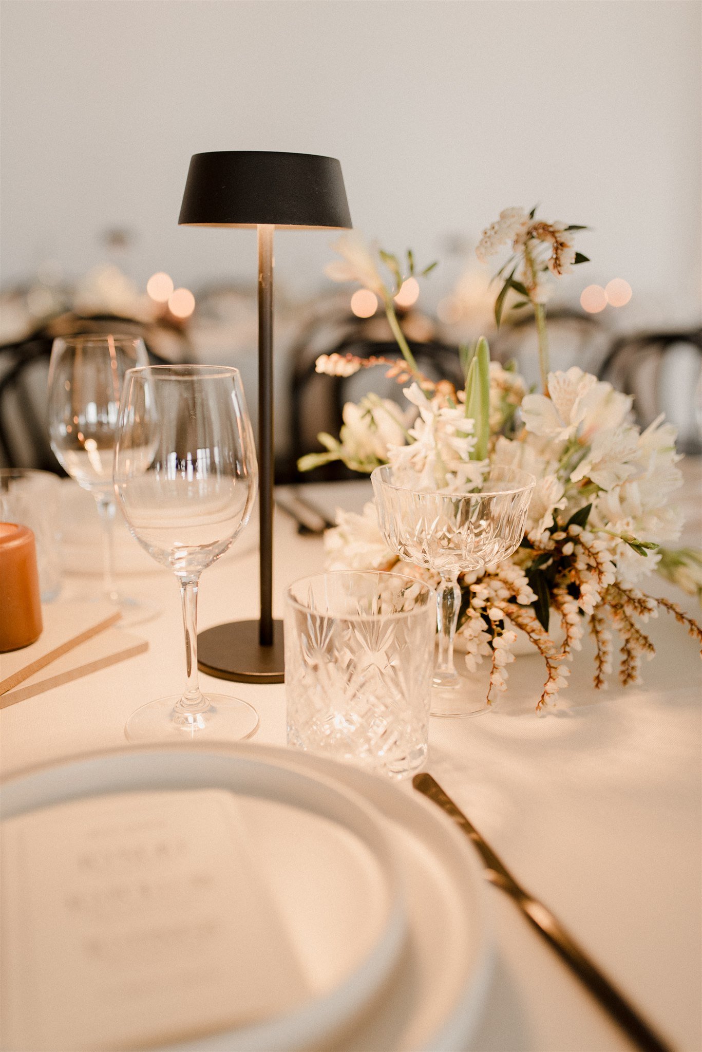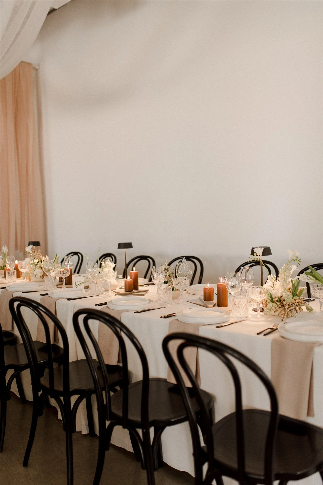 Layering in taupe napkins and sand toned vessels added more warmth, and the black cutlery and lamps tied through to the chairs in a clean, simple way.