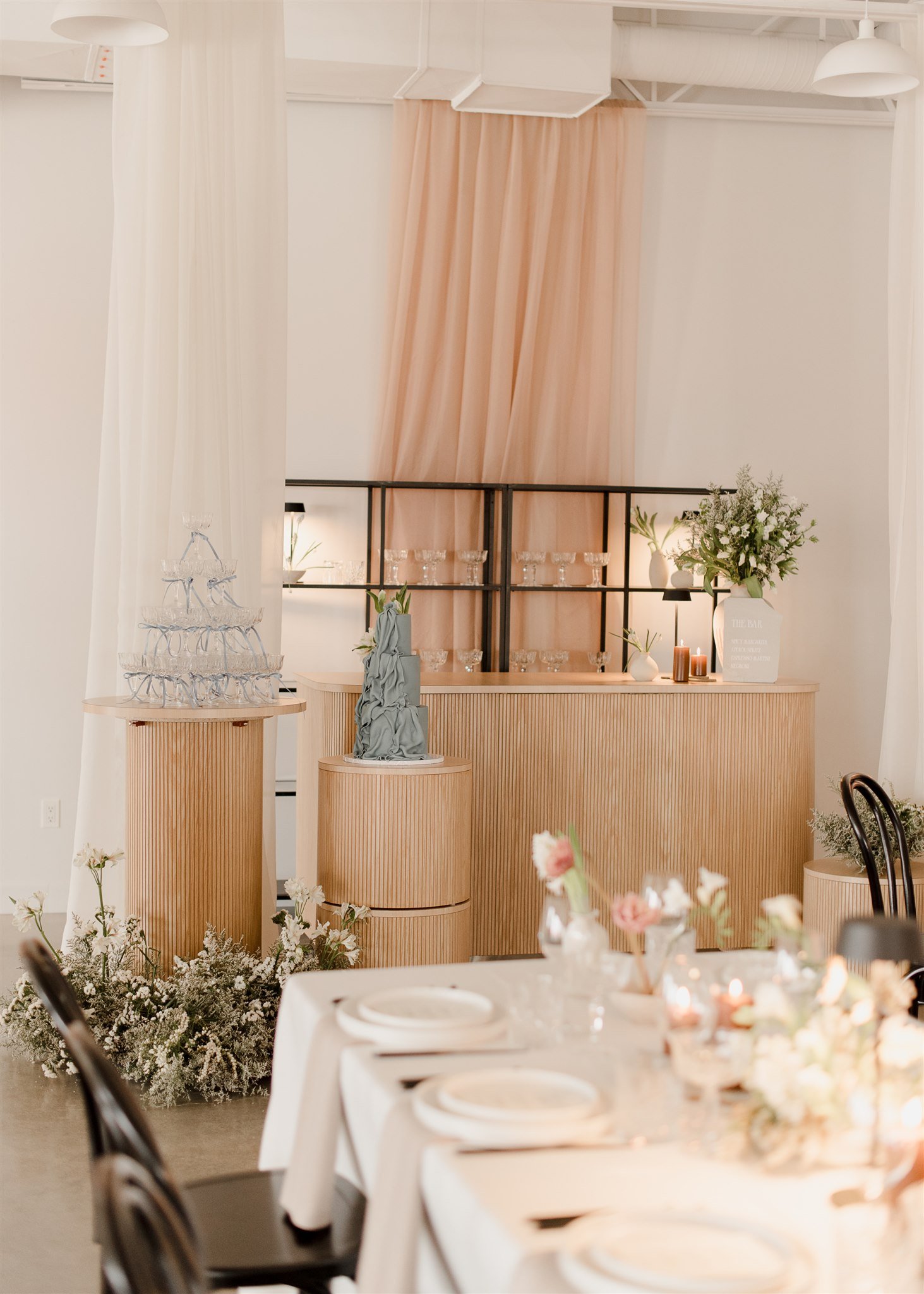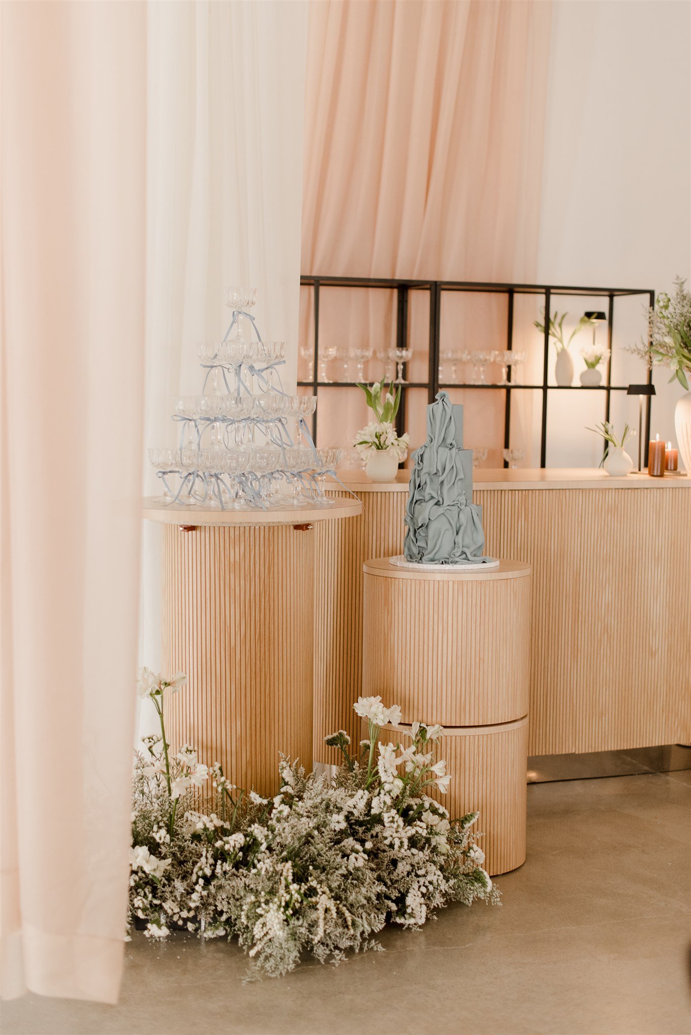 Including a bar feature was a must-have for me, to show how we can extend a design further. Collective’s Waverly collection was perfect. We added a champagne tower (one of Vanessa’s only requests!), layered in some stone vases, and repurposed florals from the ceremony aisle to the base of the cake table to make it a moment.