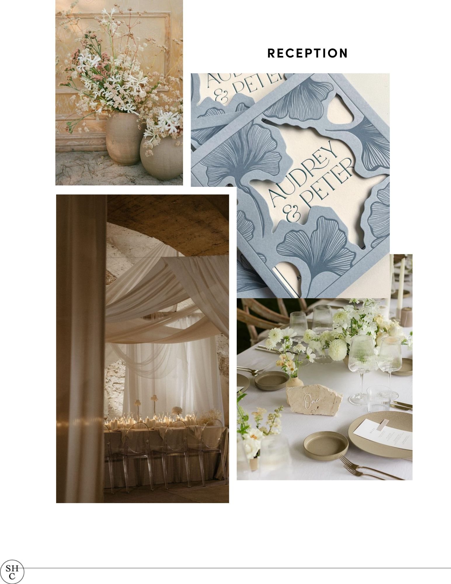 It’s not all that frequent that I get to design the entire reception from start to finish, and I really enjoy digging into that complete process. For this warm, neutral wedding reception at Novella, I started with a brief overview of the colour palette and textural elements I wanted to highlight.