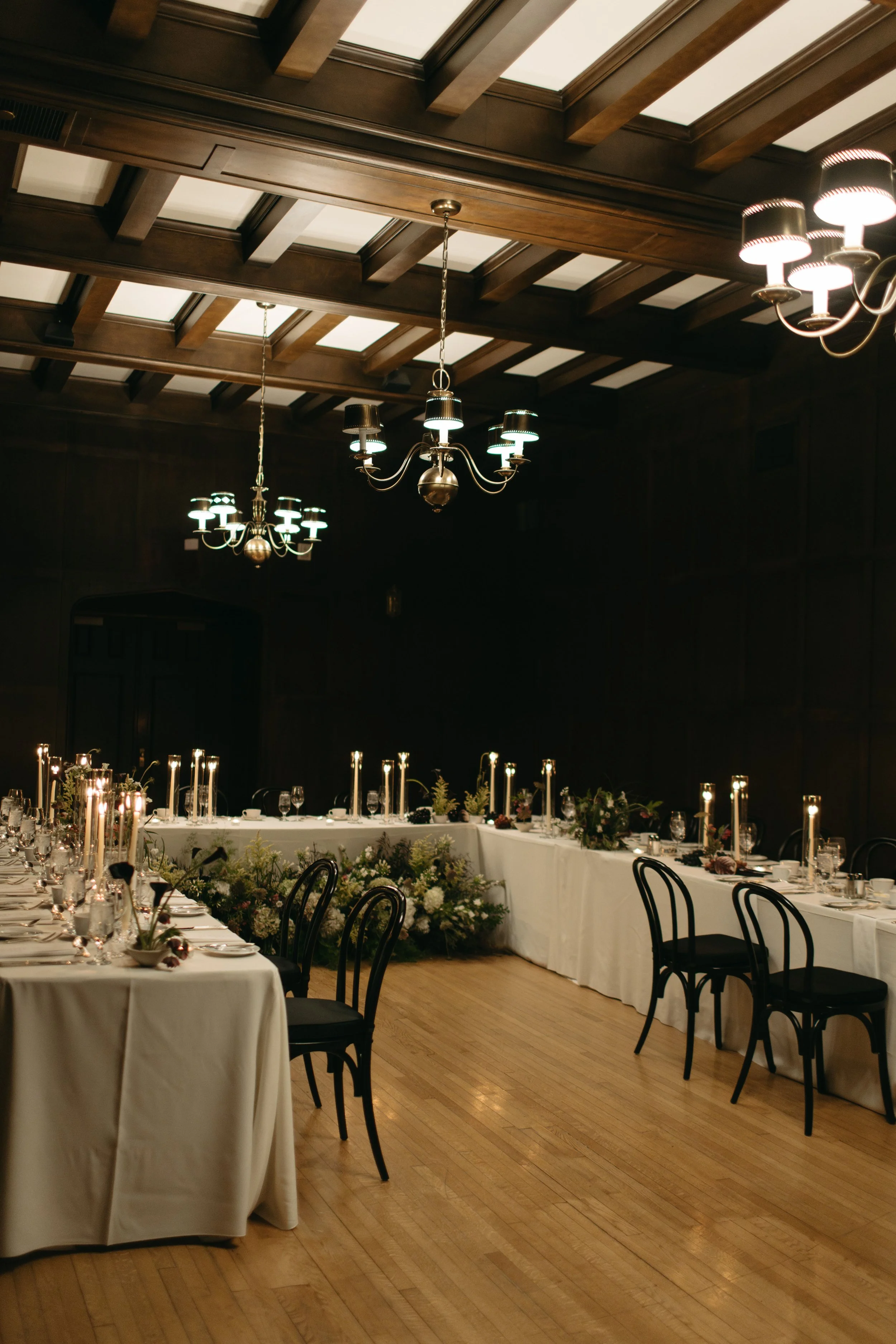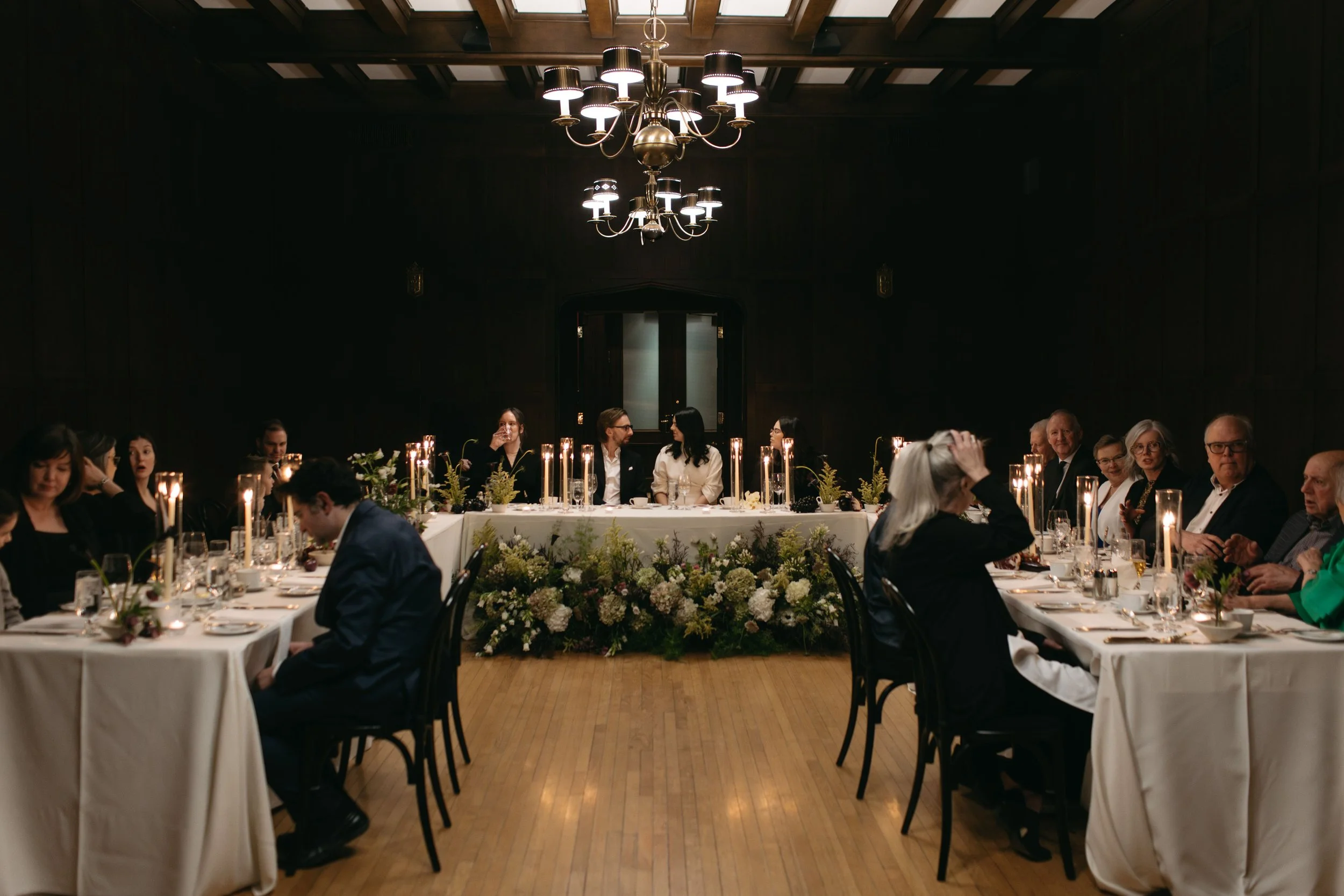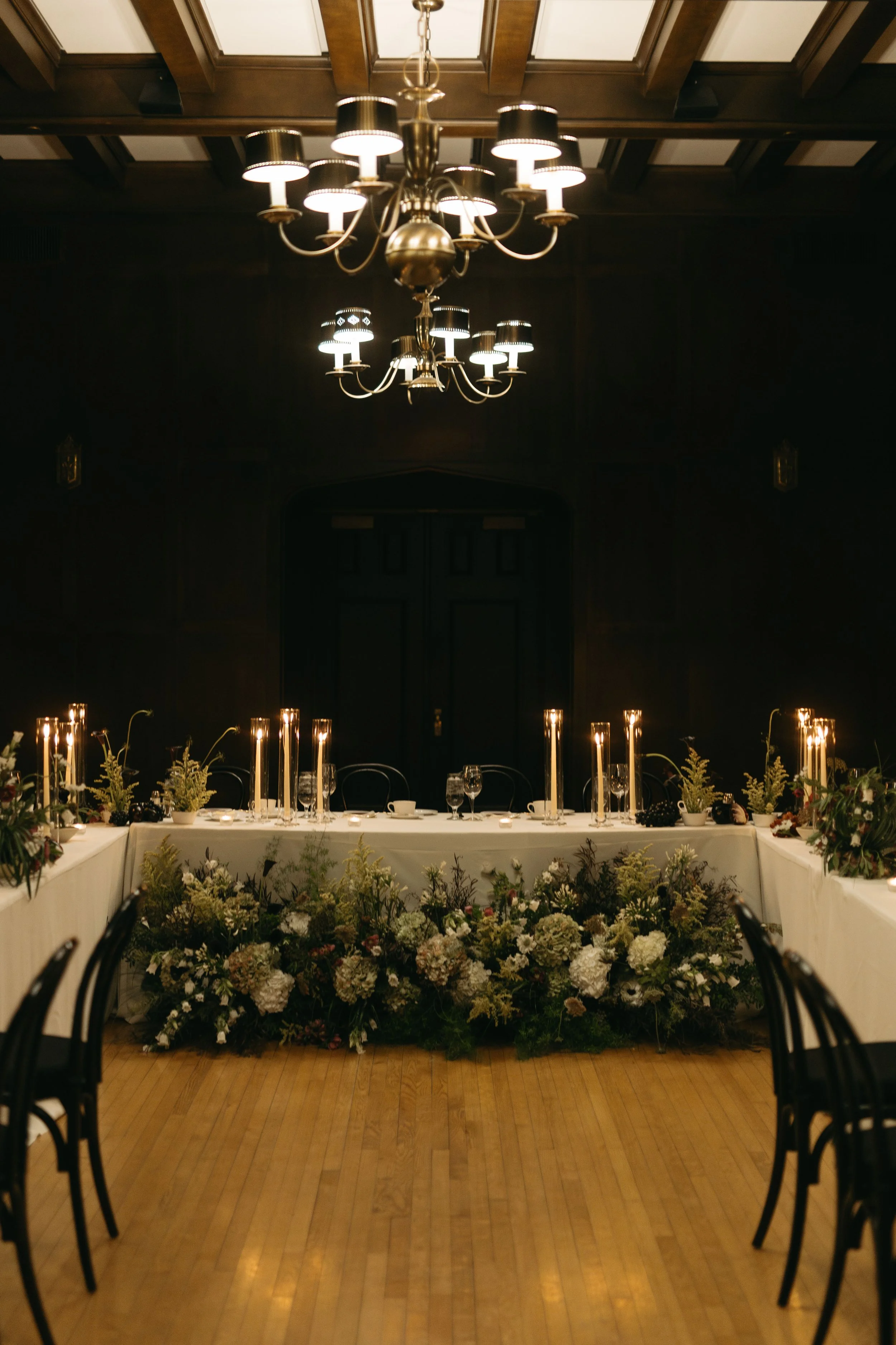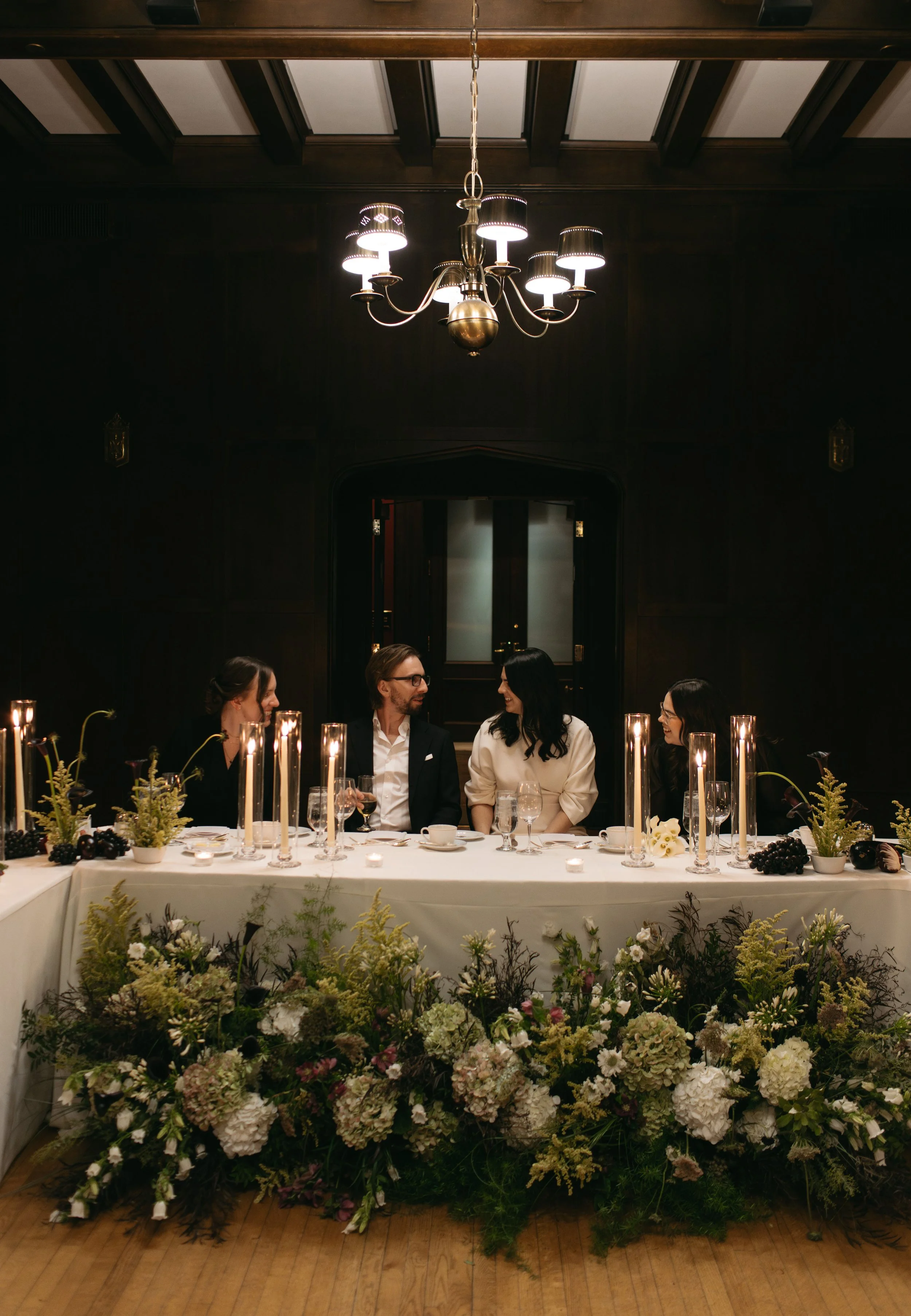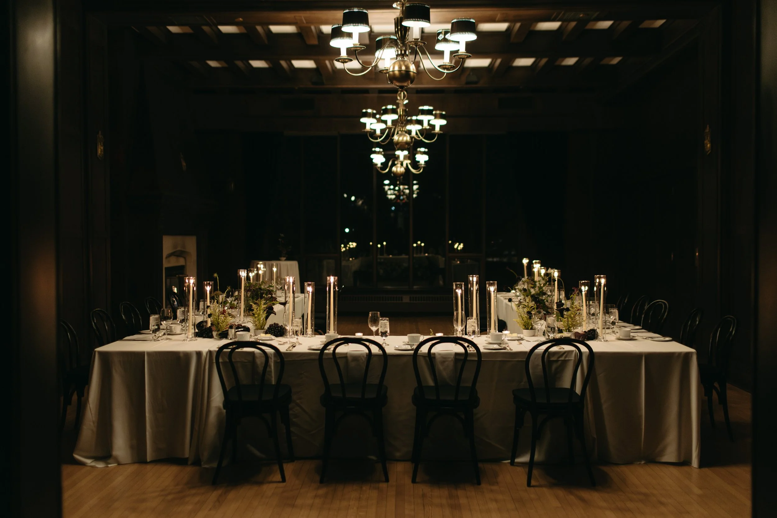 Early on, E sent me a design board with her ideas and the general vibes for their 2026 destination wedding, which she wanted to feel similar to their Winnipeg winter wedding. We decided to flip the moodiness level, amping it up in the Oak Room with more deep tones and lots of candlelight.
