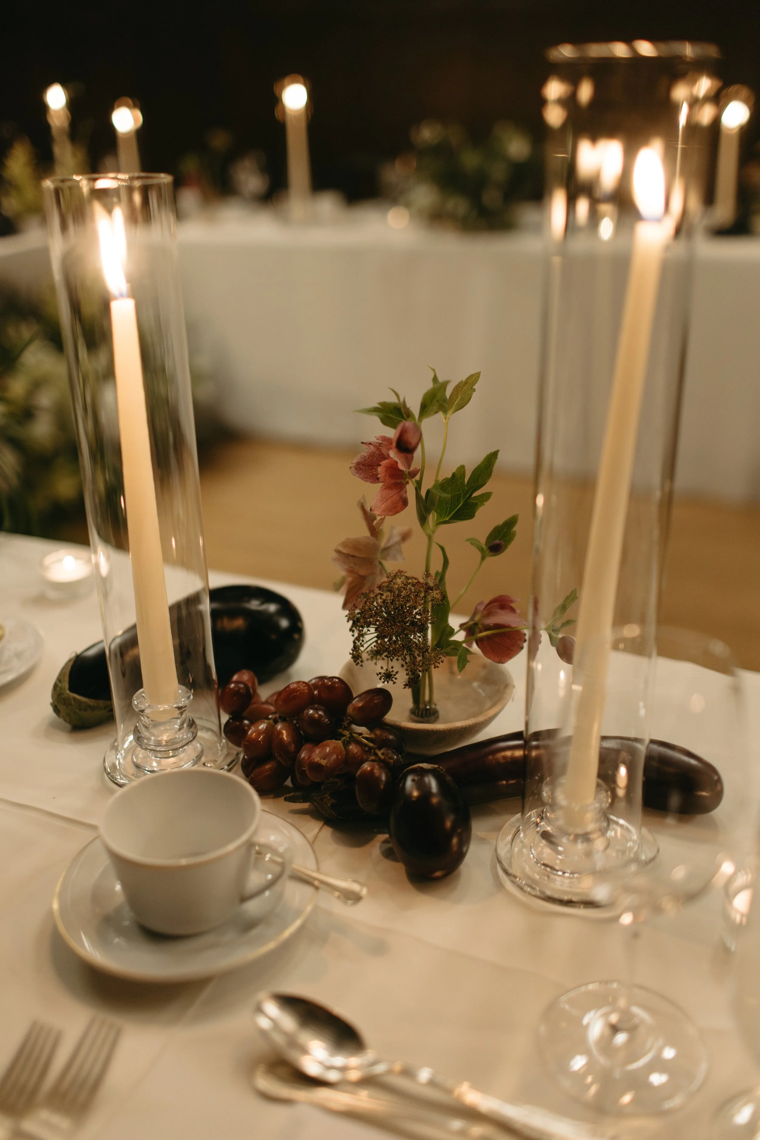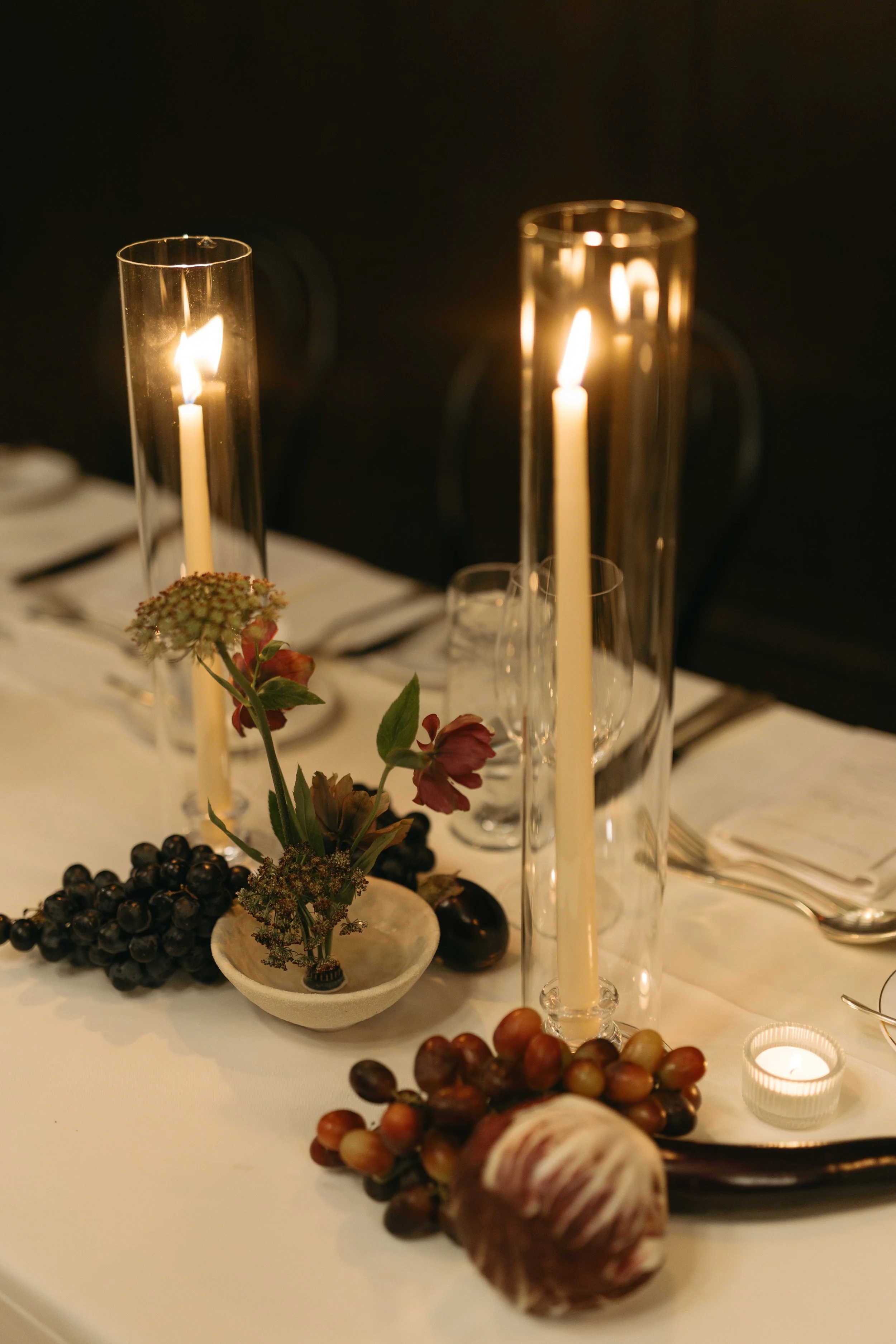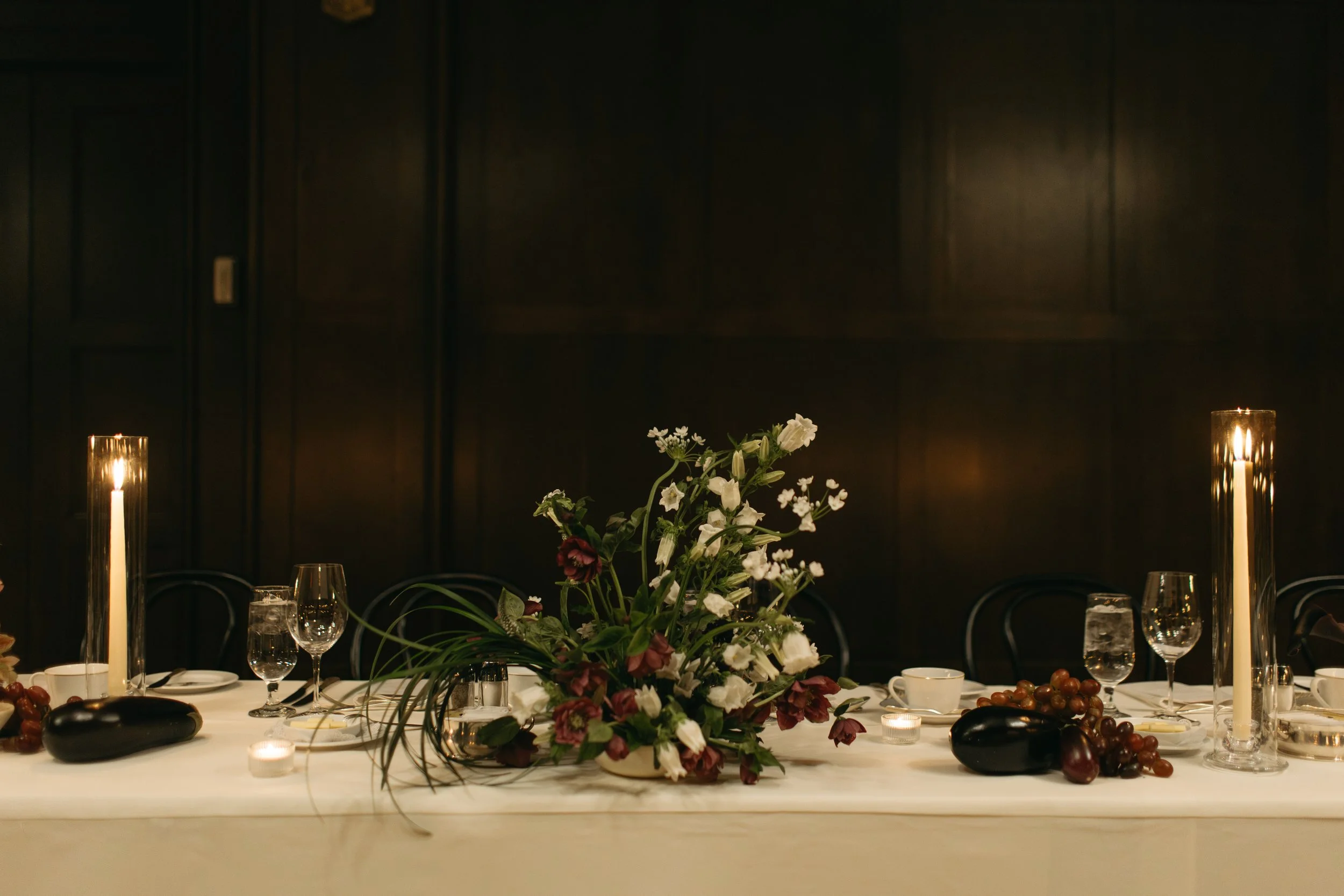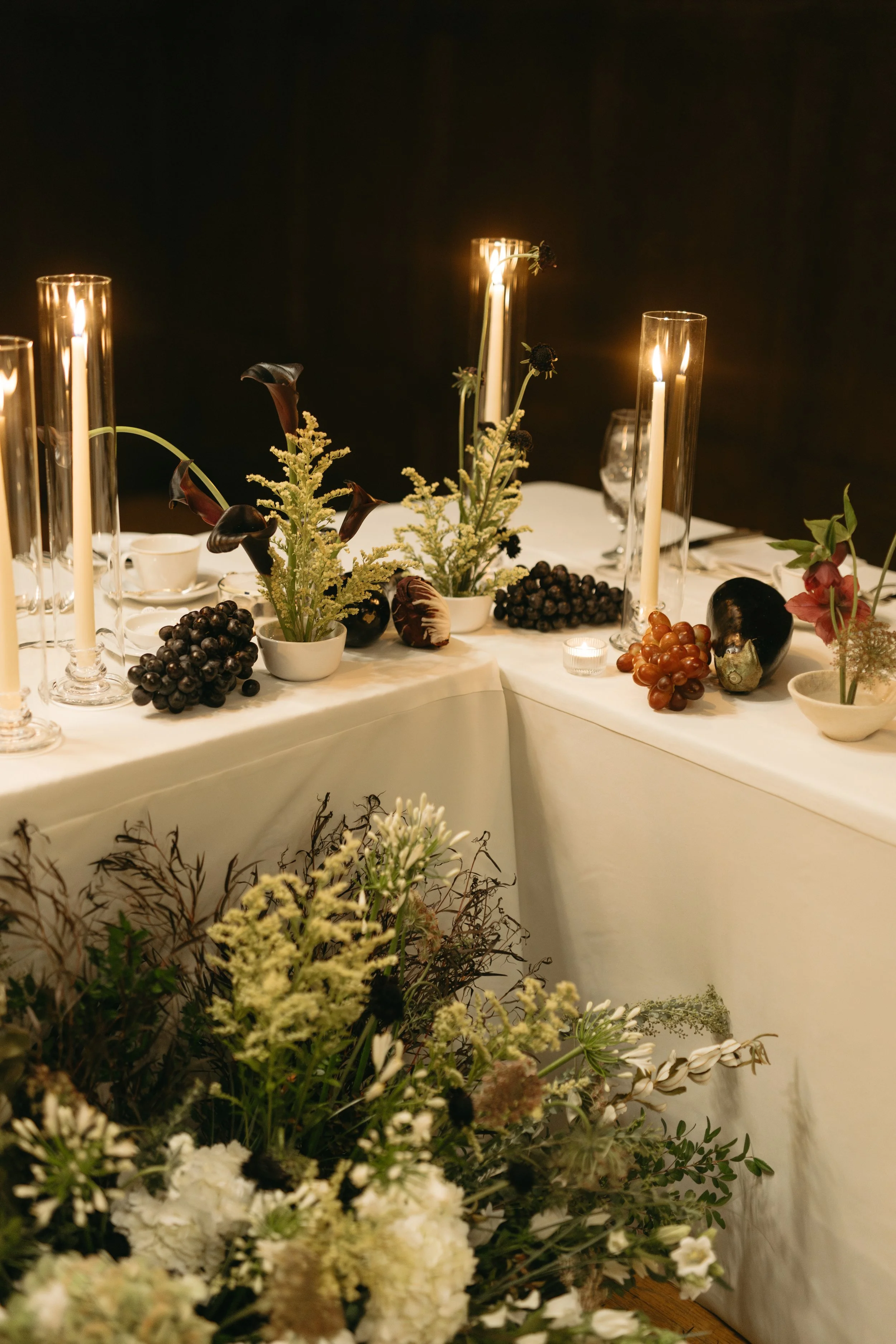 To complete the styling, I tucked in a few types of grapes, radicchios, and eggplants to amp up the moody tones, along with tall ivory taper candles to bring lots of twinkling light.