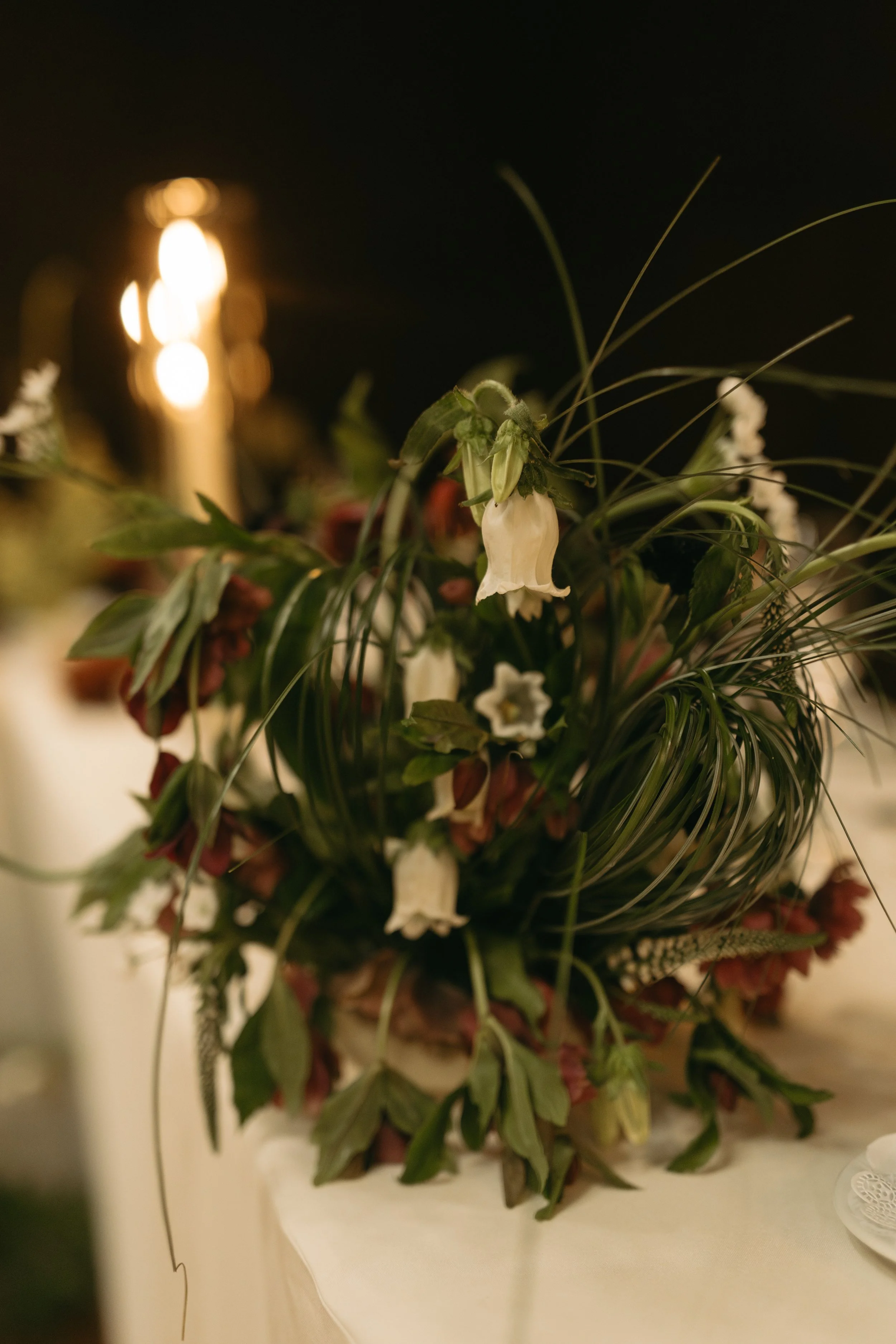 In terms of tabletop design elements, the couple really gave me free reign. We decided on the deep plummy burgundy tones with whites, greens, and touches of creamy yellows, and lots of taper candlelight, and after that, it was all up to me. My favourite ❤️