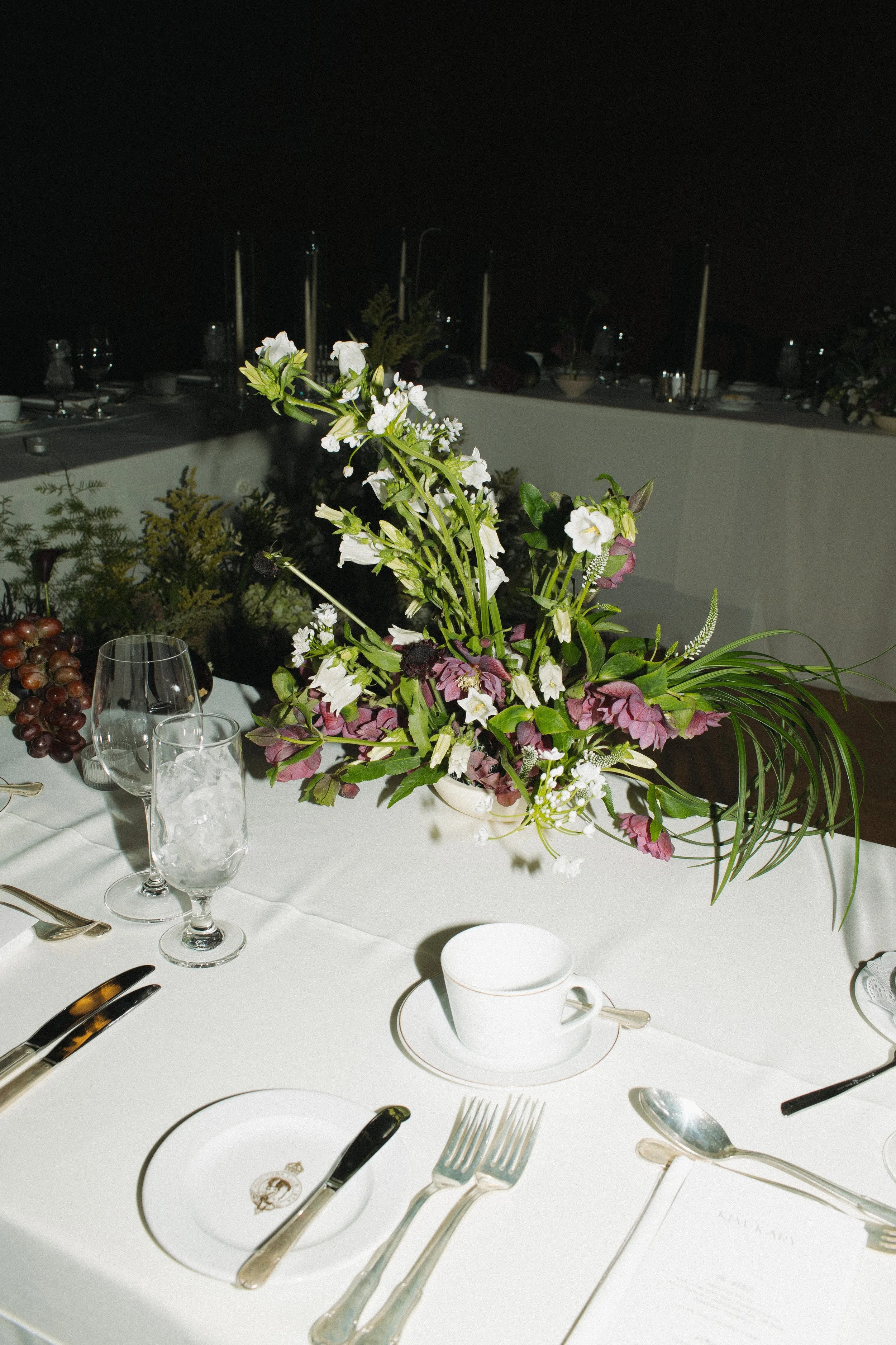 I decided to design a mix of smaller pin frog arrangements in organic ceramic vases, with a few larger ones tucked in where the table space allowed. I chose deep eggplant mini calla lilies, a lot of hellebores and chocolate lace, along with some sculptural feeling white campanula.