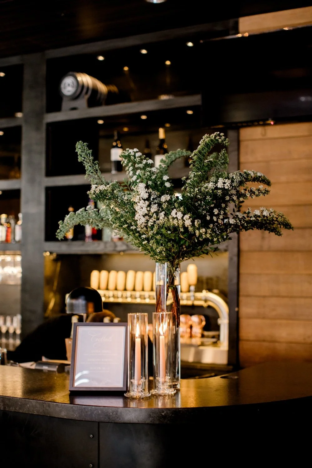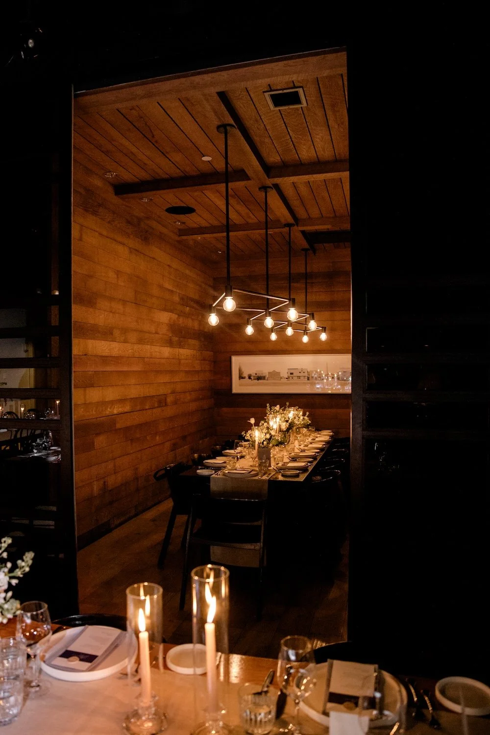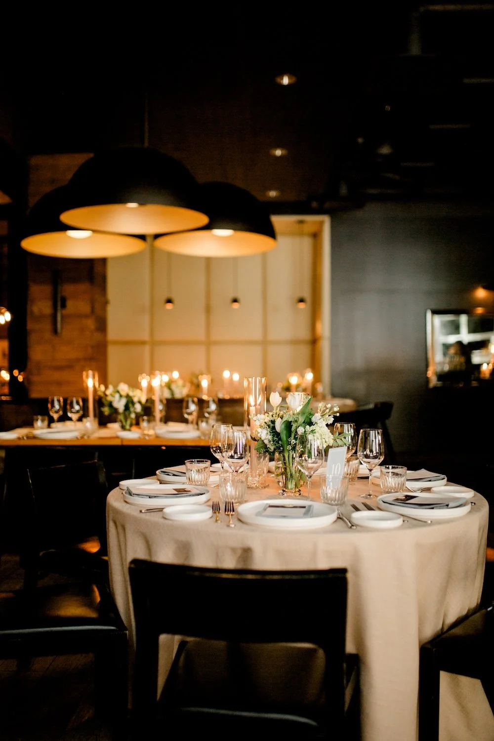 We included the classic elements of taper candles and central floral arrangements, modernizing them for the restaurant setting with modern floral styling, warm neutral candles, and varied heights to create visual interest.