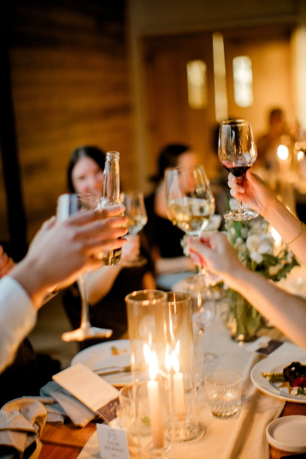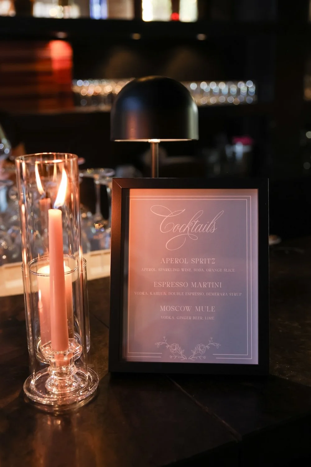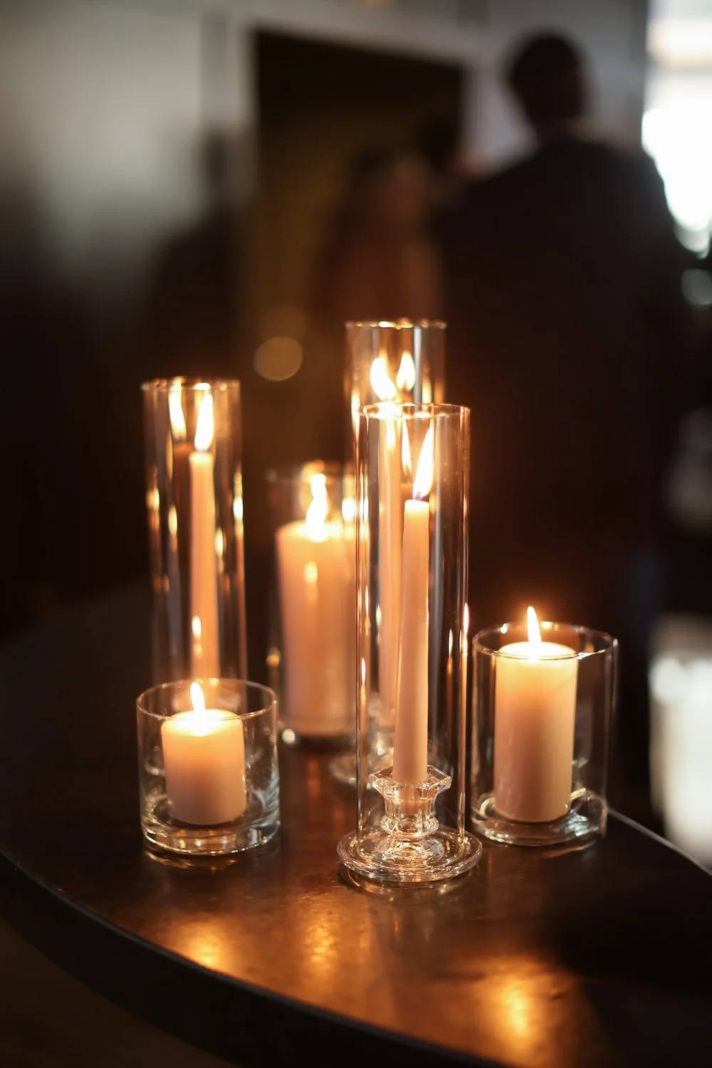 We included the classic elements of taper candles and central floral arrangements, modernizing them for the restaurant setting with modern floral styling, warm neutral candles, and varied heights to create visual interest.