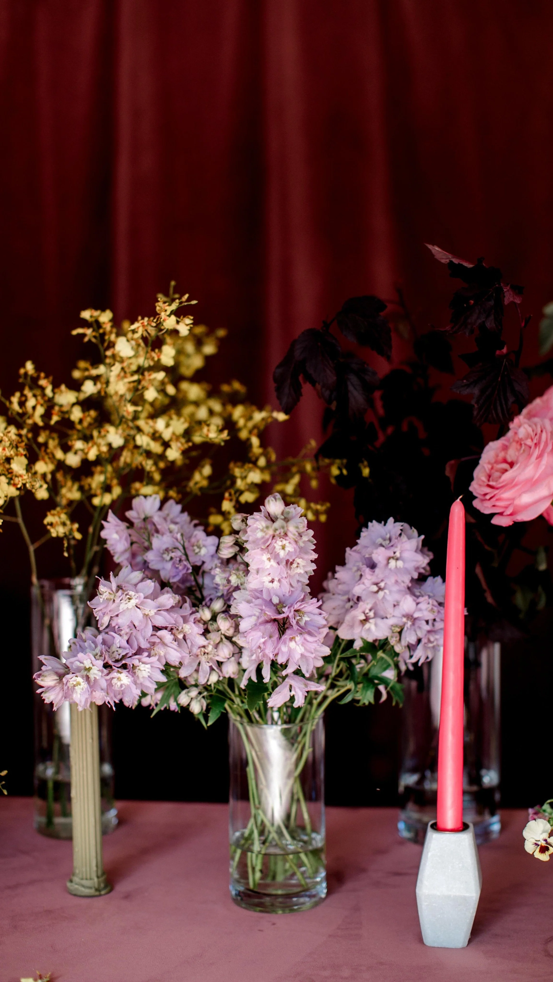 See what I mean?! This room together in a really beautiful way. As a spotlight, behind the head table I created this hanging installation. Birch bark poles combined with plenty of hanging vine and flowers along with hanging candles and it turned out wonderfully. I owe very many thanks to my assistant Danielle for hep help with this!