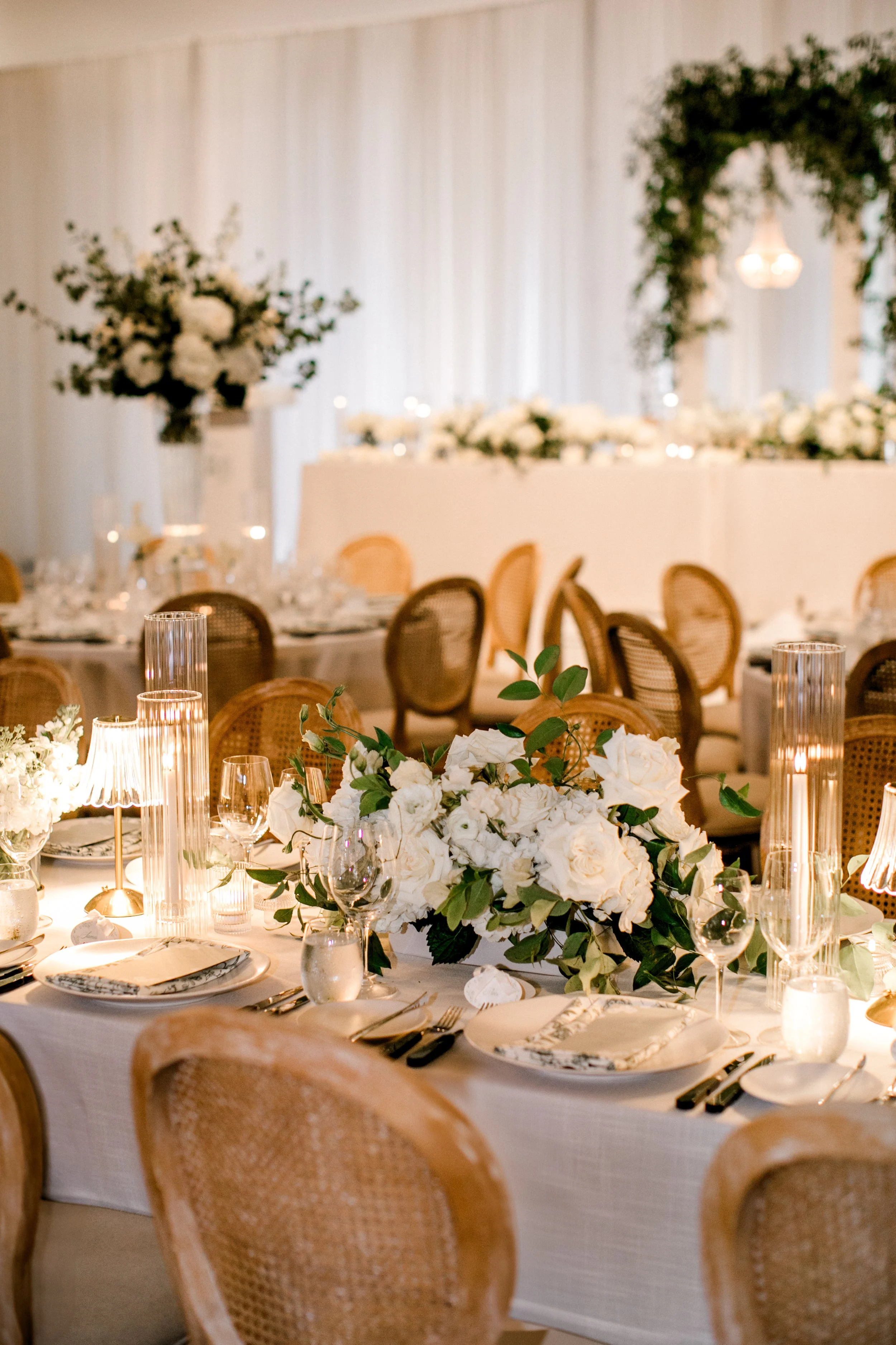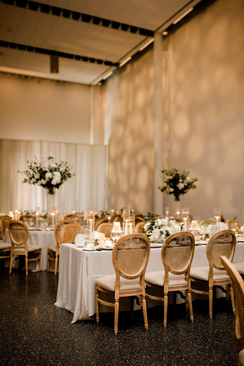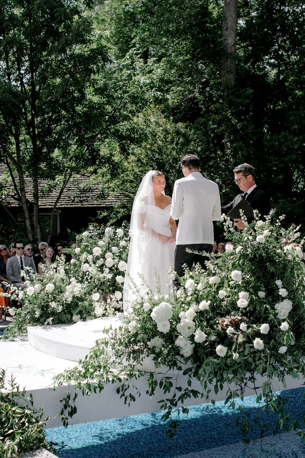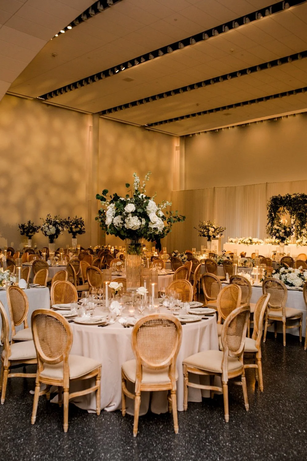 Together with their planner, Soiree Event Planning, we created a stunning ceremony, featuring an aisle filled with candlelight, leading to a modern altar set with varied gold plinths and luxurious floral accents.