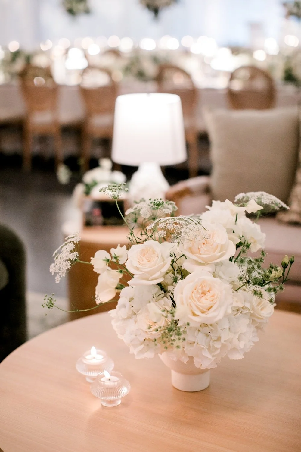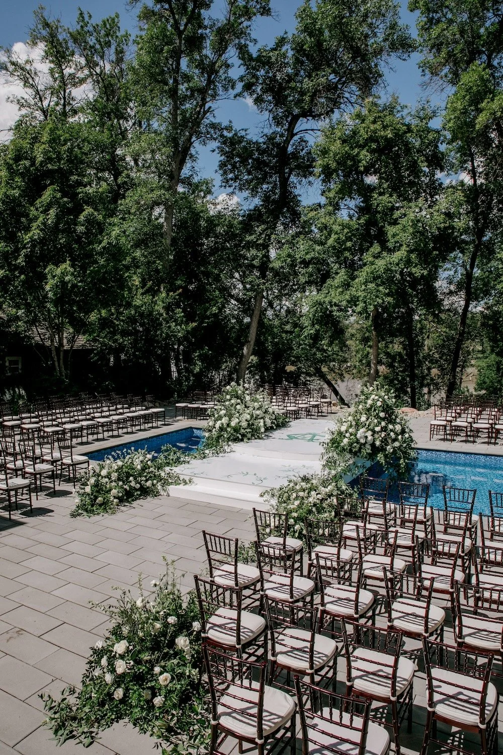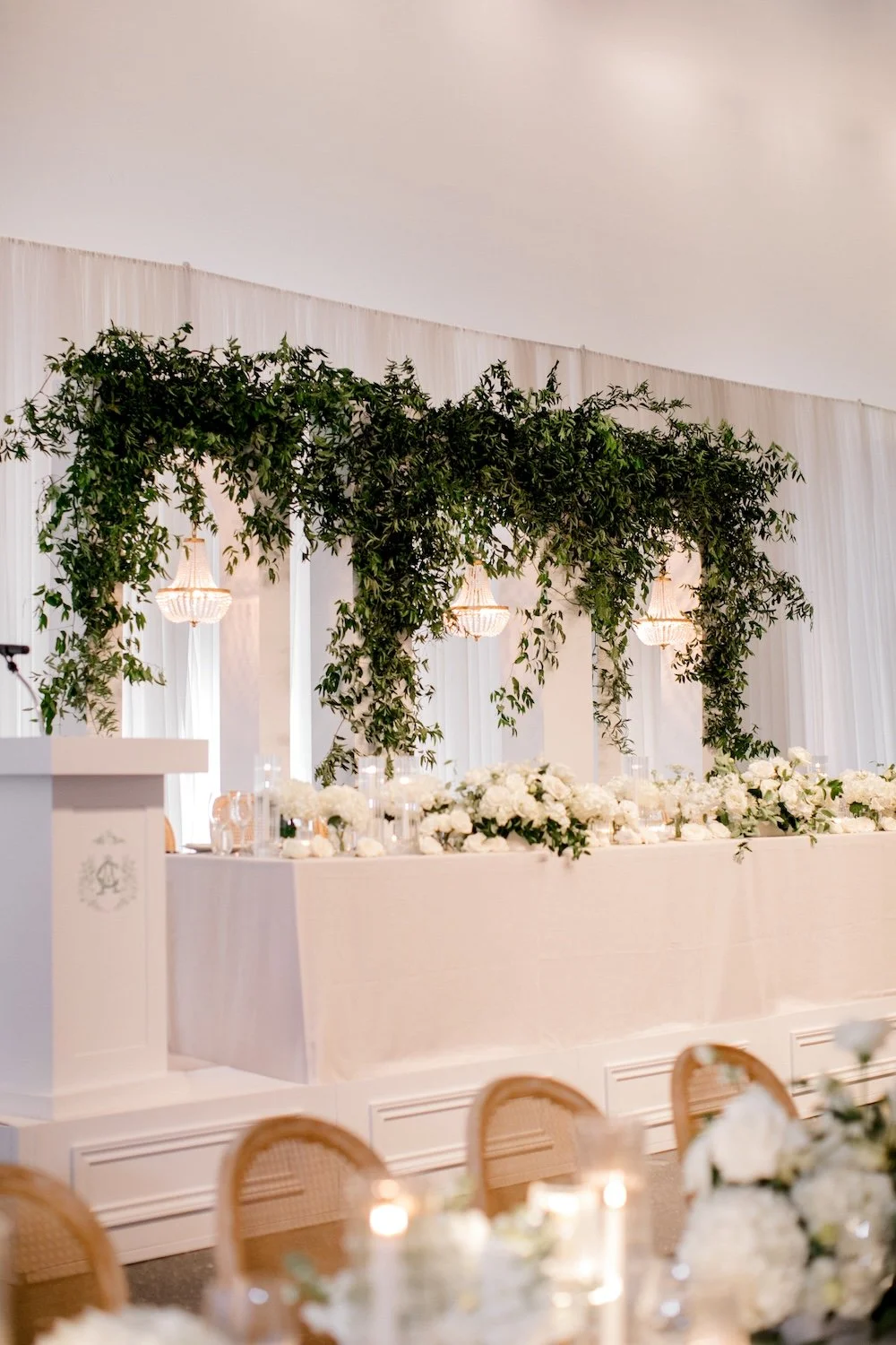 Together with their planner, Soiree Event Planning, we created a stunning ceremony, featuring an aisle filled with candlelight, leading to a modern altar set with varied gold plinths and luxurious floral accents.