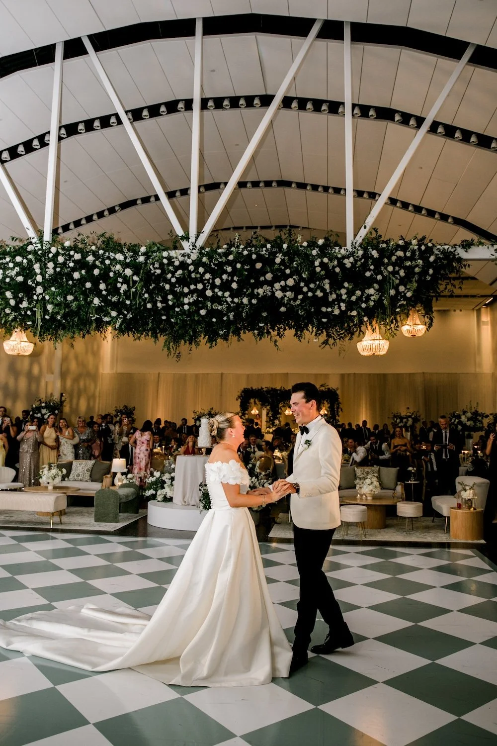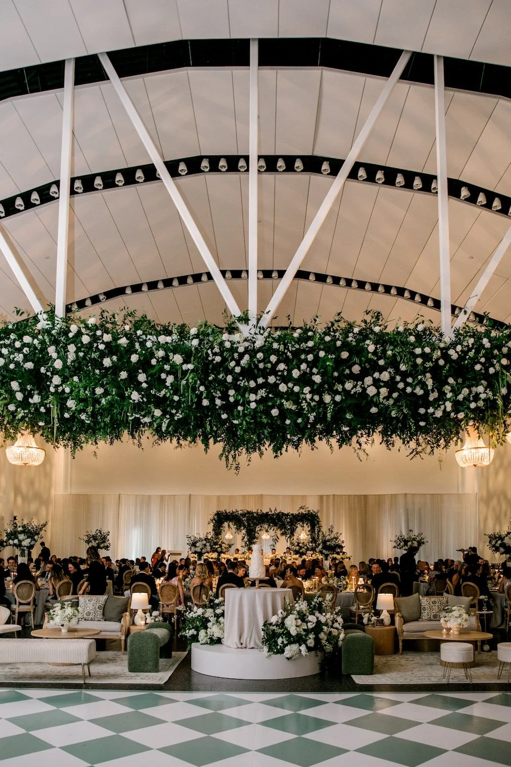A classic black and white checked dance floor, modern candleabras, and layers of red blooms composed the reception design in the Crystal Ballroom.